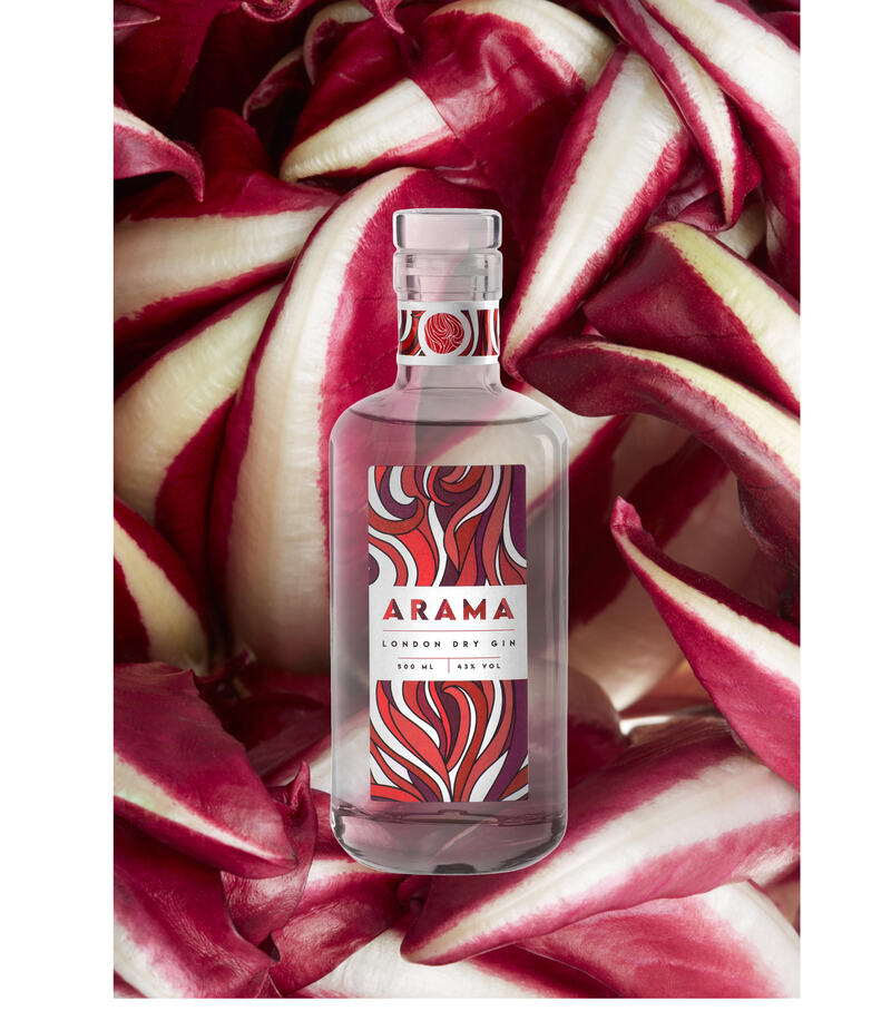 Packaged in a 50cl clear glass bottle, the stylised label features flowing shapes in vivid colours, symbolising the Italian red radicchio at the heart of the gin.