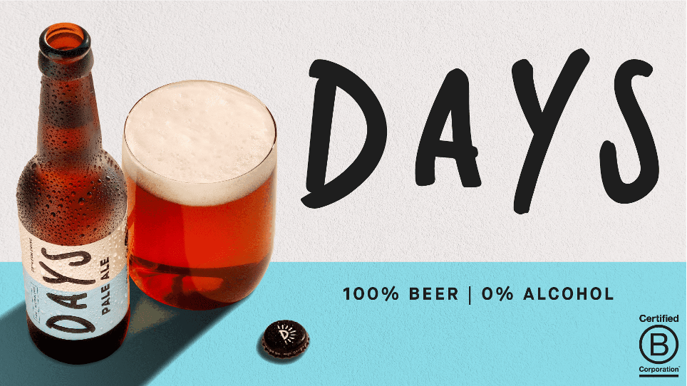 Days is Certified B Corp, brewing 0.0% beers by combining locally sourced Scottish water and malt barley in an alcohol-free brewing process.