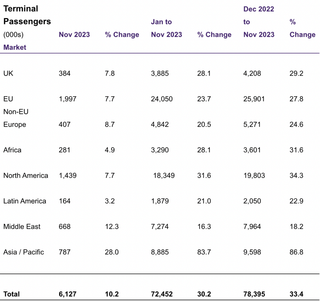 UK. London Heathrow Airport served 6.1 million passengers in November, a rise of +10.2% year-on-year.