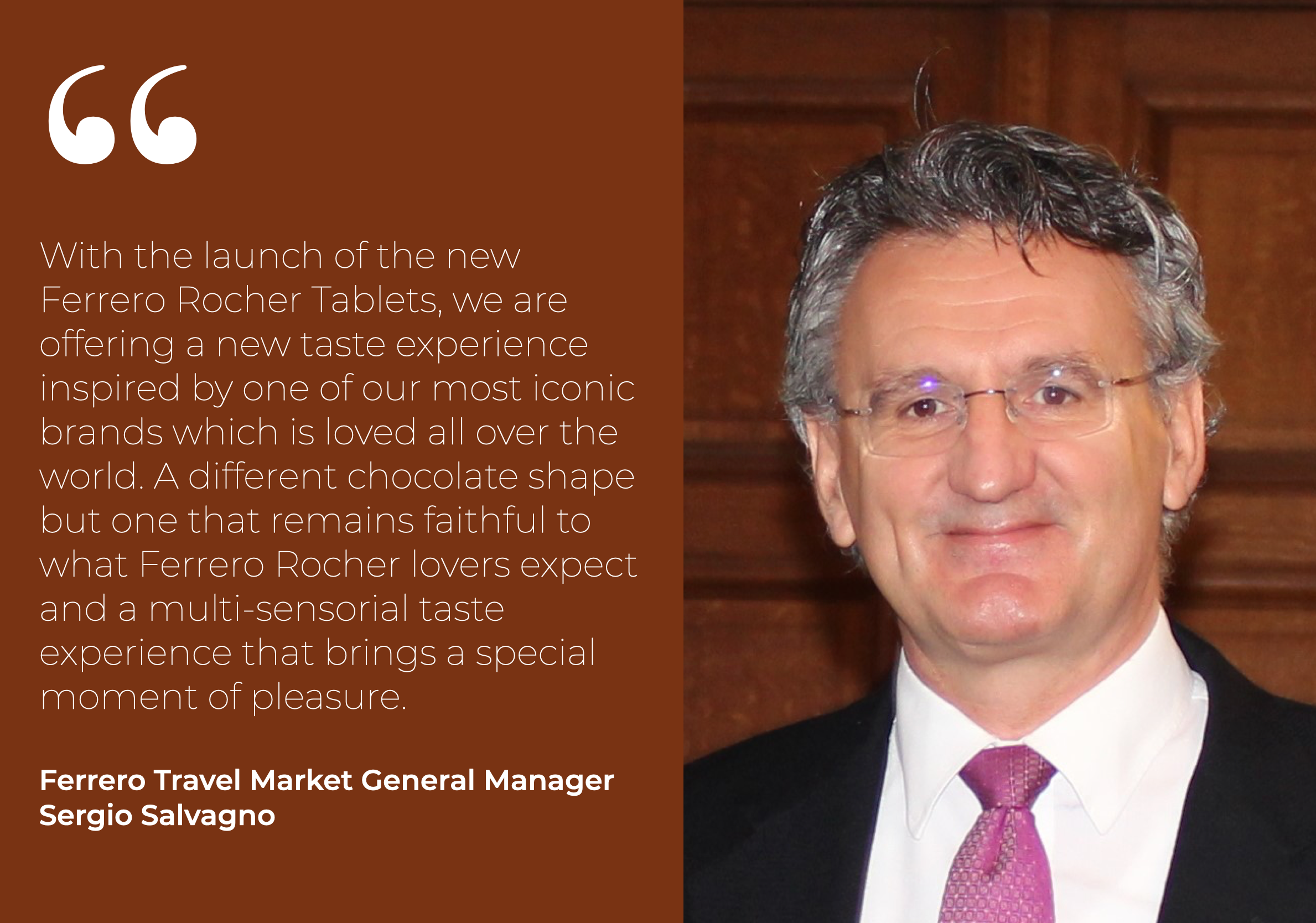 “With the launch of the new Ferrero Rocher Tablets, we are offering a new taste experience inspired by one of our most iconic brands which is loved all over the world,” commented Ferrero Travel Market General Manager Sergio Salvagno. “A different chocolate shape, but one that remains faithful to what Ferrero Rocher lovers expect ,and a multi-sensorial taste experience that brings a special moment of pleasure. We have achieved this remarkable result thanks to our constant focus on product innovation and the passion for quality that has always distinguished us.”