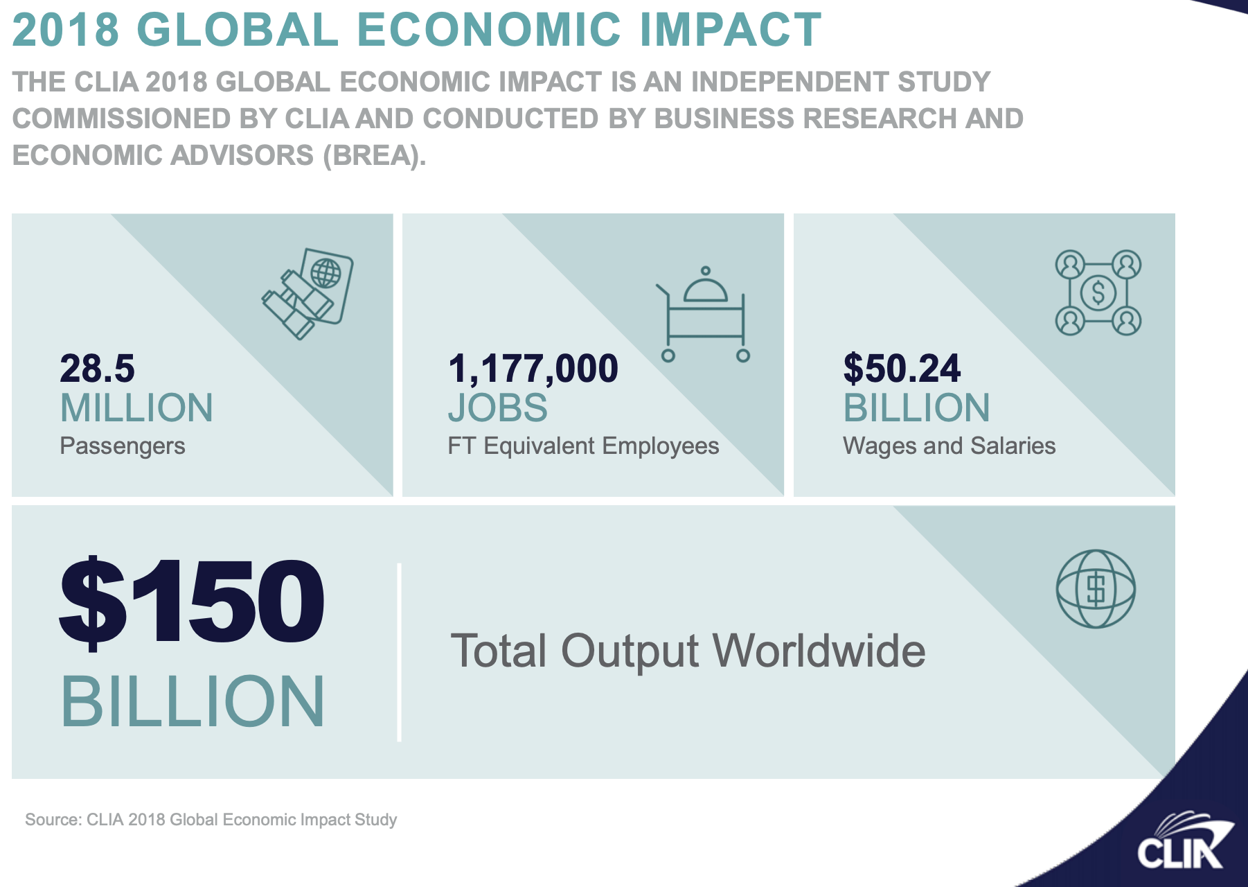 According to the report, cruising sustained 1,177,000 jobs, equalling US$50.24 billion in wages and salaries and US$150 billion total output worldwide in 2018. The CLIA added that passengers spend US$376 on average in port cities before boarding a cruise and US$101 in each visiting port destination during a cruise.