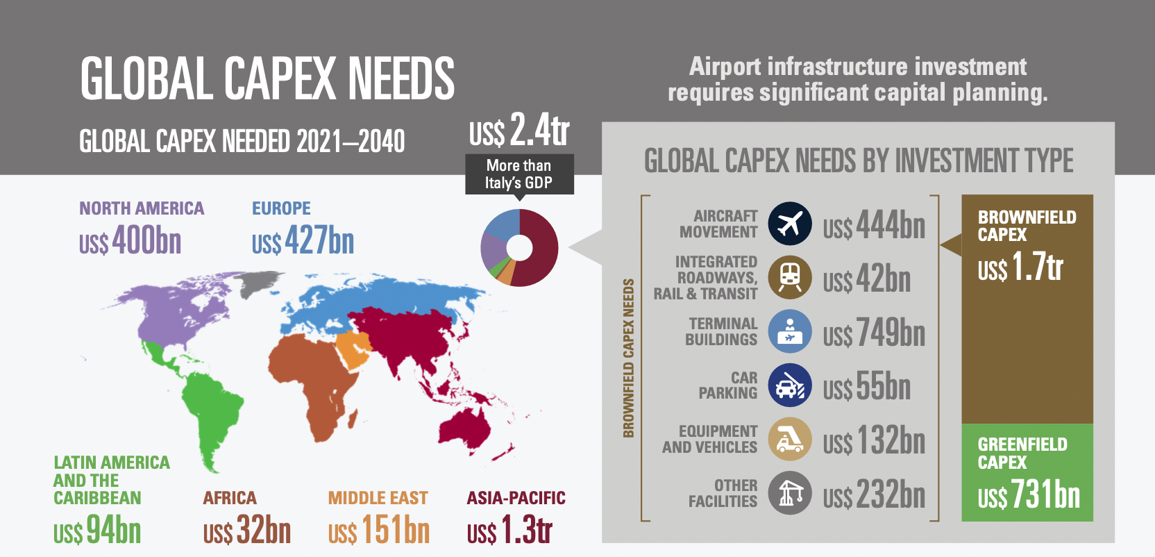 INTERNATIONAL. Airports Council International (ACI) World’s latest forecasts for the global airport sector show that around US$2.4 trillion in capital investments will be needed to address the long-term trend in passenger demand to 2040.