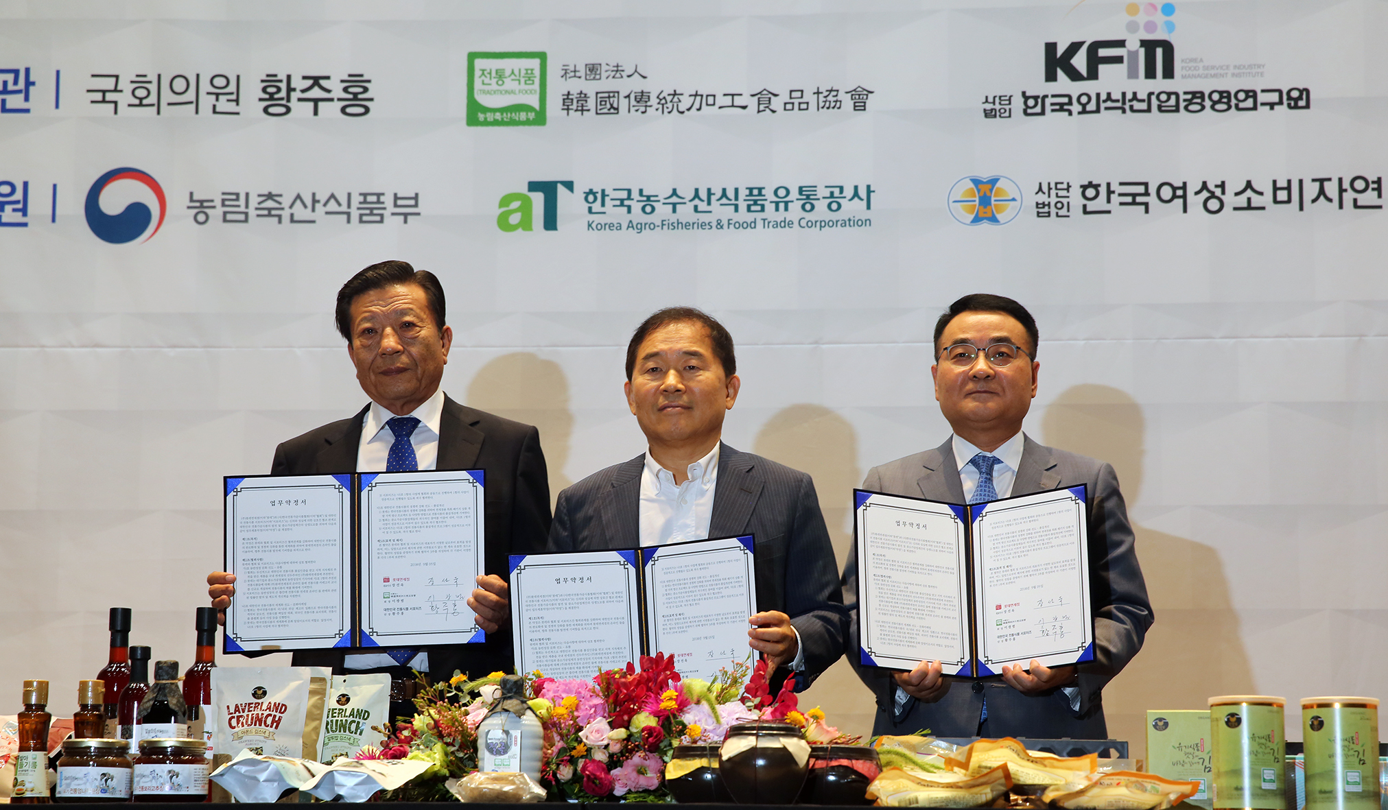 Underlining the importance of the initiative, Lotte Duty Free CEO Jang Sun-wook, Korea Traditional Processed Food Association President Lee Kwang-bum and Korea Traditional Food Supporters General Manager Hwang Ju-Hong attended the signing.