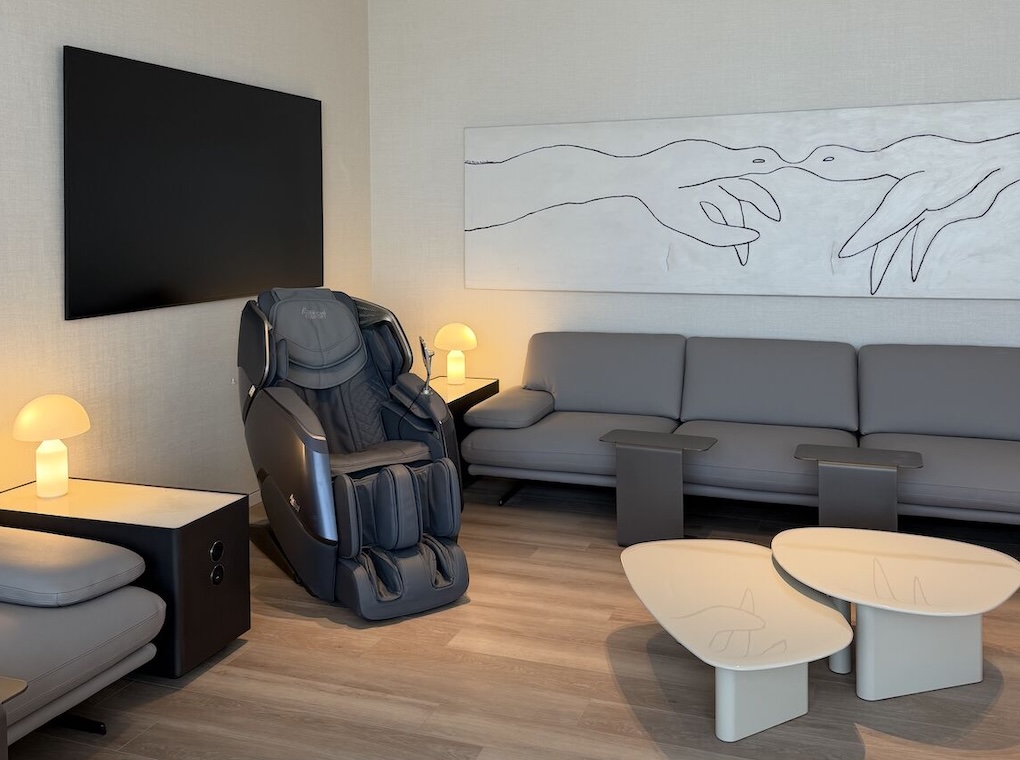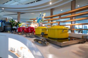 Wellness is prioritised through the lounge’s Retreat area, offering private massage booths, alongside upgraded shower suites with customisable settings.