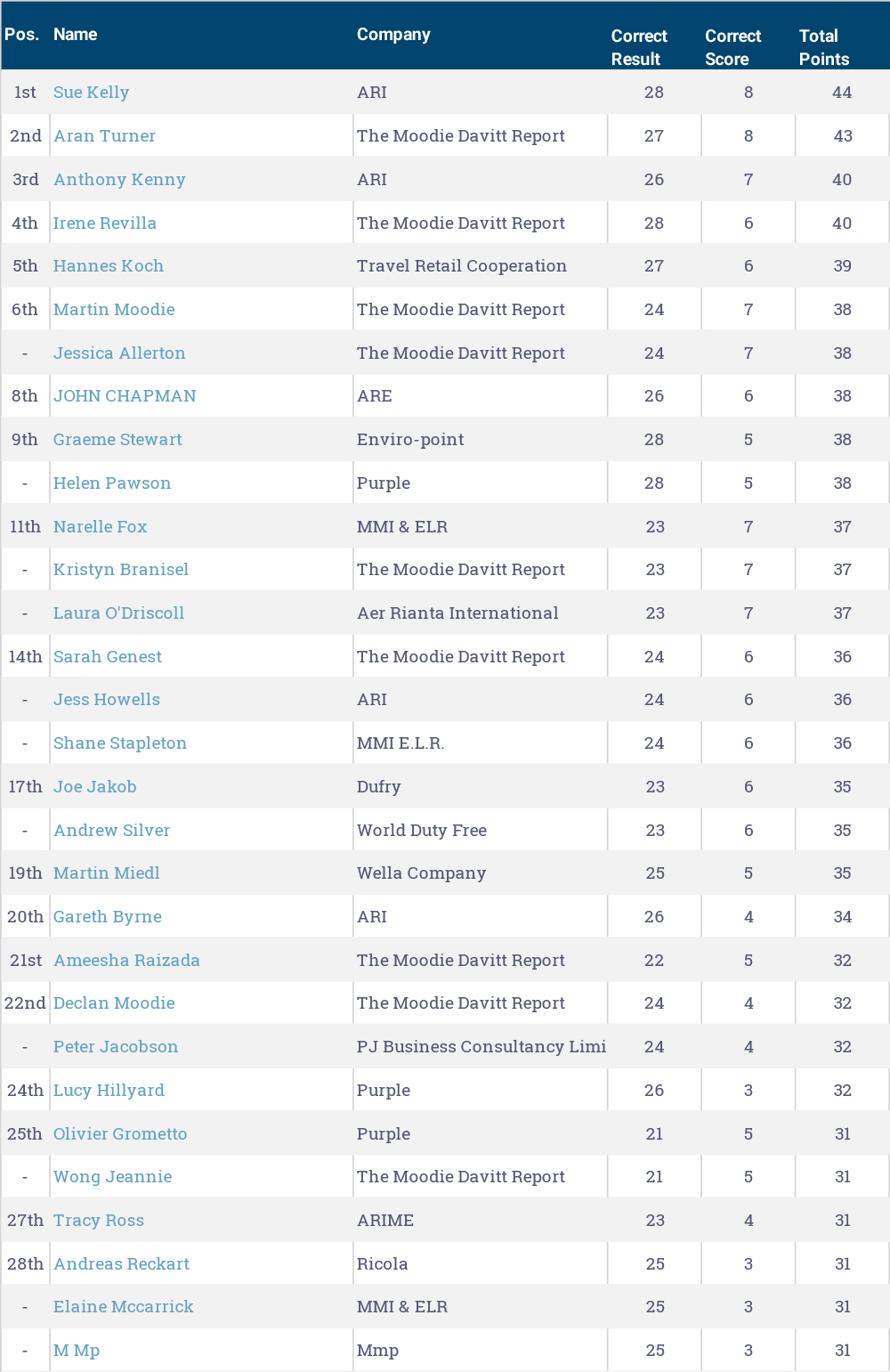 Just two points behind Sue, The Moodie Davitt Report International Account Manager Aran Turner now sits in second while third-placed ARI Chief Commercial Officer & Deputy CEO Anthony Kenny remains tucked behind the leaders alongside The Moodie Davitt Report Publisher Irene Revilla riding high along with her native Spain (now into the last 16) in the tournament.