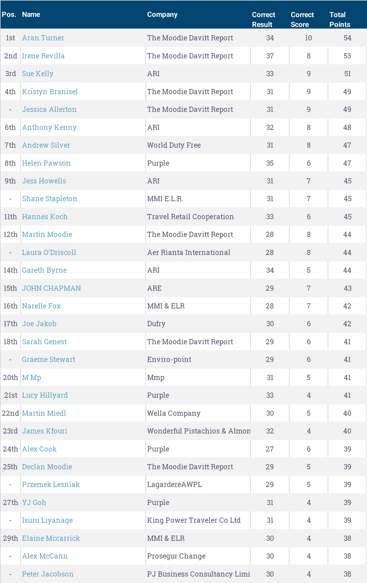 Just one point behind Irene, Aer Rianta International (ARI) Global Head of Business Development Sue Kelly, who has been prominent throughout the competition, sits in third. The Moodie Davitt Report’s Subscriptions and Administration Manager Kristyn Branisel and Research Director Jessica Allerton sit in 4th equal place just ahead of ARI Chief Commercial Officer & Deputy CEO Anthony Kenny, Andrew Silver from World Duty Free and Helen Pawson from Purple.