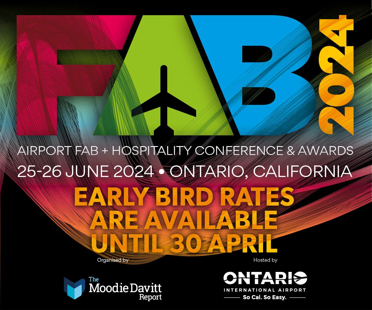 INTERNATIONAL. Discounted ‘Early Bird’ rates are available until 30 April for the eagerly anticipated Airport FAB + Hospitality Conference & Awards, hosted this year by Ontario International Airport. The conference takes place at the Ontario Convention Center in Ontario, California on 25-26 June.
