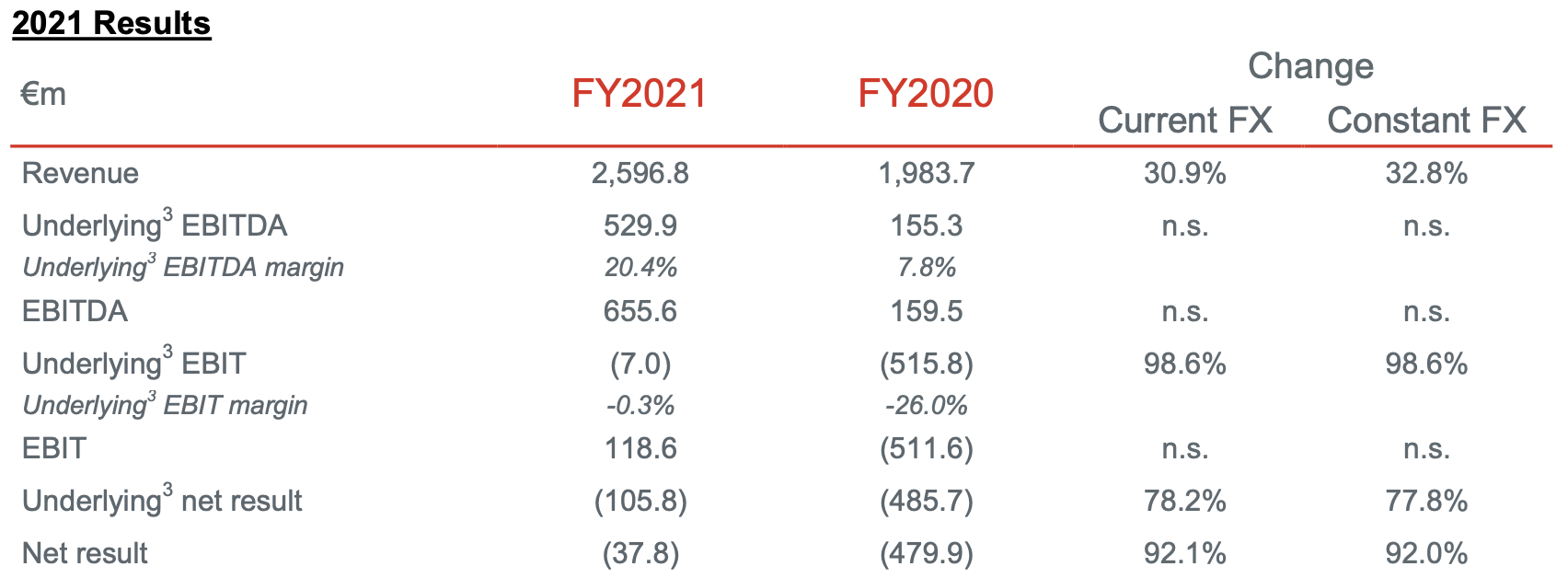 Underlying EBIT of negative €7 million in 2021 compared favourably with the negative €515.8 million in FY2020. The group said this was due to an improved product mix, higher operating efficiency and rent renegotiation.