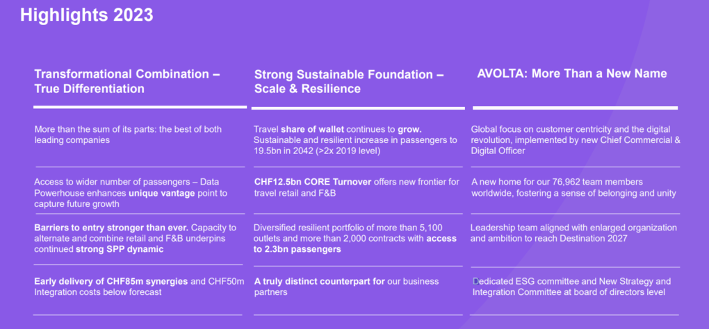 Dufry Group CEO Xavier Rossinyol commented: “2023 was a very successful year for Avolta. The company completed a transformational business combination redefining the global travel retail and food & beverage industry.