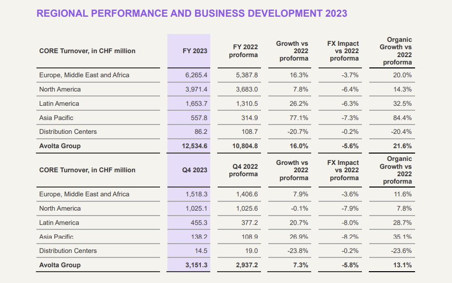 In Q4 2023, turnover for the combined region reached CHF1,577.5 million (US$1,788 million), with core turnover at CHF1,518.3 million (US$1,721.72 million), an organic increase of +11.6% year-on-year.