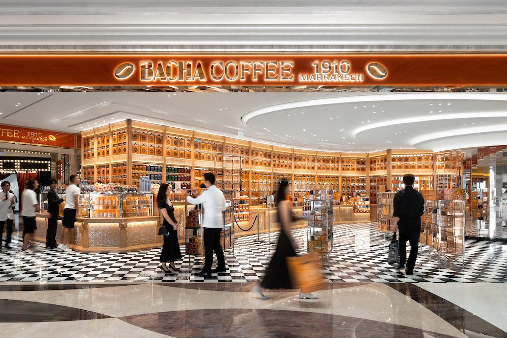 Located on Level 1, the 230sq m store features a 270° open façade and the brand’s hallmark black-and-white chequered marble floors, geometric trellises and saffron-stained porticos. Bacha Coffee is represented by Blue Chip Group in several regions across Asia Pacific travel retail.