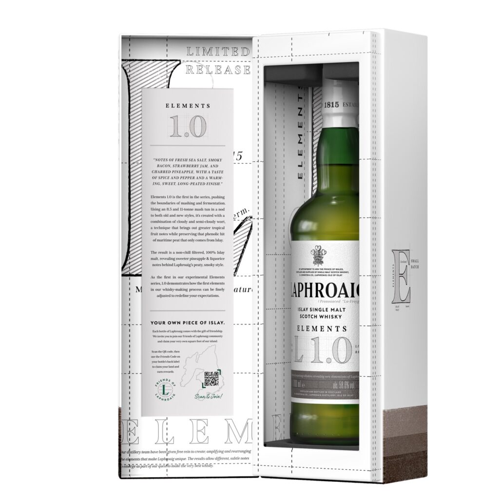 Elements 1.0 comes in a black and white presentation box. Each bottle comes with an invitation to join the Friends of Laphroaig community, where customers can scan a QR code to claim their very own square foot of Islay and earn exclusive rewards. ✈