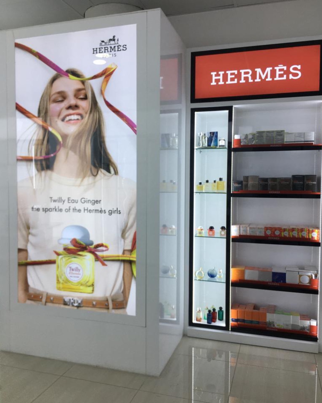 Hermès’ range of fragrances is presented in a wall display with a light box installation. Some of the lines featured include Twilly D’Hermès, Eau De Rhubarbe Ecarlate, Equipage, Terre D’Hermès, Eau Des Merveilles, Concentrate D’Orange Verte and H24.