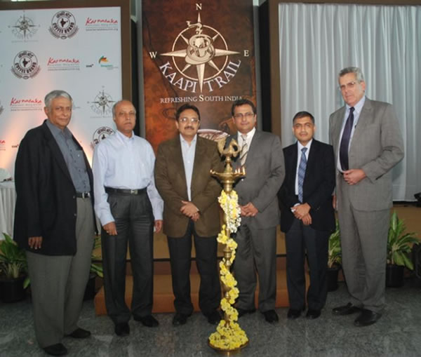At the Kaapi Trail launch at Bengaluru International Airport, from L-R: India Coffee Trust President Anil Bhandari; Government of Karnataka Director of Tourism Viswanatha Reddy; Coffee Board of India Chairman Jawaid Akhtar; BIAL President Operations Hari Marar; BIAL Director Finance Bhaskar Bodapati, BIAL Senior Vice President Tom Shimmins |