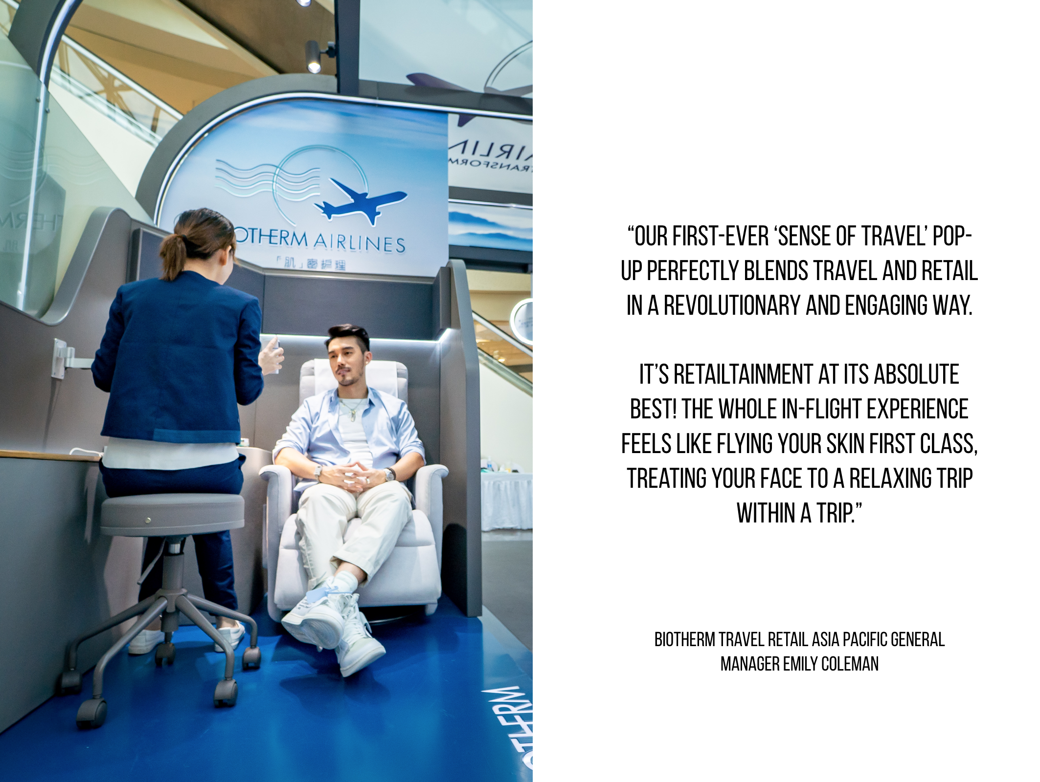 According to Biotherm Travel Retail Asia Pacific General Manager Emily Coleman, the pop-up was a great example of first-class retailtainment. She said: “Our first-ever ‘Sense of Travel’ pop-up perfectly blends travel and retail in a revolutionary and engaging way. It’s retailtainment at its absolute best! The whole in-flight experience feels like flying your skin first class, treating your face to a relaxing trip within a trip.”
