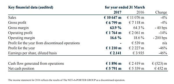 In the year ended 31 March 2017, Richemont posted a -4% decrease in sales, which it said reflected a growth in retail sales offset by a decline in wholesale business. Operating profit fell -14%.