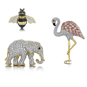 Left: The new Simplicity Bead Bracelets can be stacked for a layered look; Right: Quirky animal brooches from the Adrian Buckley Signature collection | |