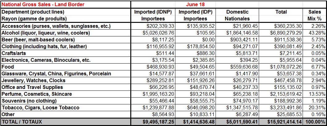 In the first six months of 2018, airport duty free sales increased +6.8% to C$232.6million (US$179.4 million). Land border sales rose +2% to C$64.5million (US$49.8million).