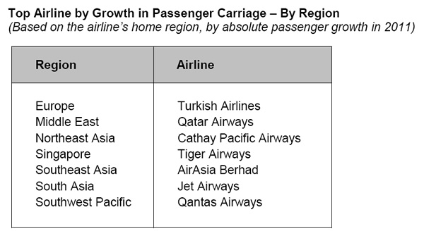 Awards were also presented to airlines from different regions which registered the strongest growth in passenger traffic at Changi. These were Tiger Airways (Singapore), AirAsia Berhad (Southeast Asia), Cathay Pacific Airways (Northeast Asia), Jet Airways (South Asia), Qantas Airways (Southwest Pacific), Qatar Airways (Middle East) and Turkish Airlines (Europe). Cathay Pacific was a repeat winner, while Tiger Airways posted the strongest growth in passengers carried (44%) among airlines serving more than one million passengers at Changi.