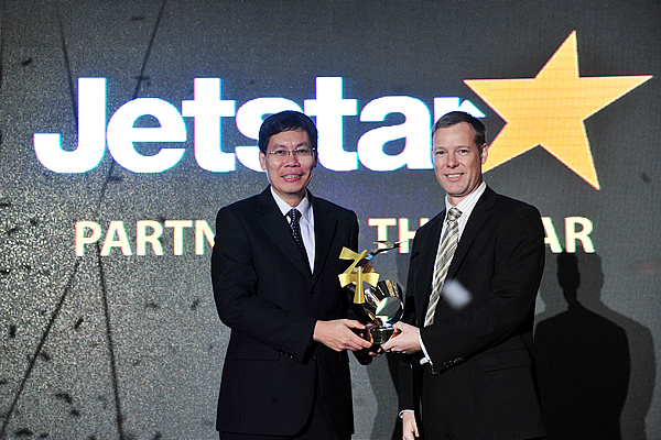 Jetstar Asia Acting CEO Paul Daff (right) receiving the “˜Partner of the Year’ award on behalf of the Jetstar Group from Minister for Transport and Second Minister for Foreign Affairs, Lui Tuck Yew (left) |