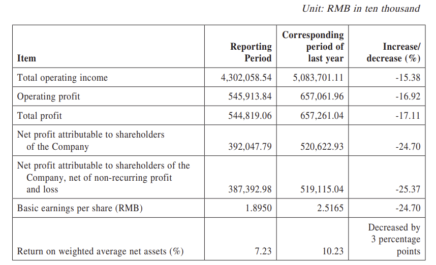 Net profit slumped -24.70% to RMB3,920.4779 million (US$550.7 million).