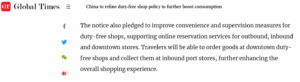 The measures are intended to boost consumption, guide the return of overseas consumption [i.e. repatriate travelling shopping abroad], attract foreigners to enter the country for shopping, and promote the healthy and orderly development of the duty-free retail business.