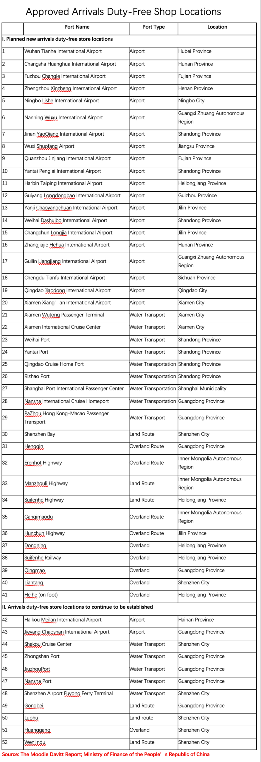 - One new duty-free shop will be established at each of 41 ports of entry, including Wuhan Tianhe International Airport. Among them, after the establishment of the Hengqin Port duty-free store, resident passengers entering from Macau will be allowed to purchase a certain quantity (up to RMB15,000/US$2,155) of duty-free goods at Hengqin Port.