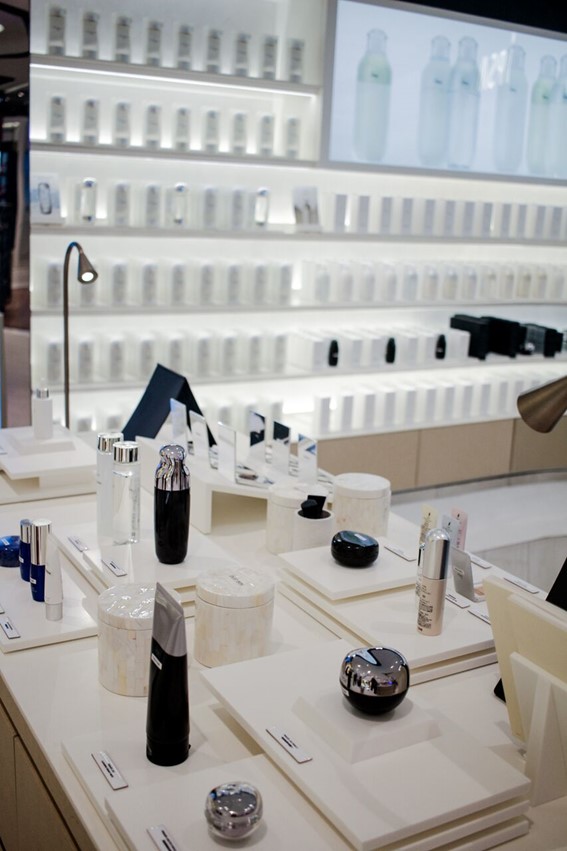 IPSA’s latest counter has been designed with the concept of a “comfortable living space” by using the brand’s signature colours – beige, white and black – and non-standardised materials. A seven-metre curved backwall allows customers to access products easily. A screen of water projection emulates the IPSA Time Reset Aqua.