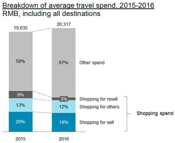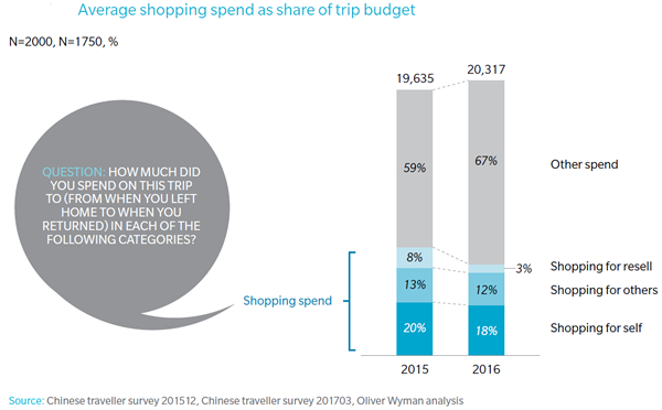 CHINA. Shopping spend as a percentage of overall travel expenditure by Chinese overseas visitors fell in 2016, according to a new report from global consulting firm Oliver Wyman.