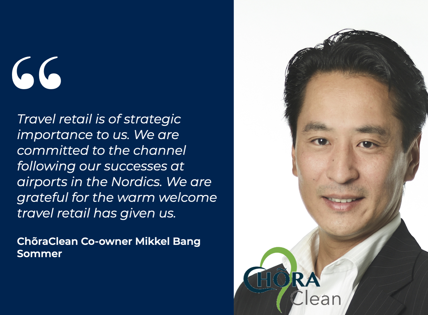 “Although our heritage is travel retail, we are committed to the online and high street retail channels too,” added Henningsen. “We want to help ChõraClean tailor turnkey solutions to airports as well as hotels, retail stores, department stores and web shops. These range from go-to-market strategies, leadership sparring and deal making, to marketing, sales and account management.”