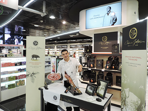 The WDFG promotion at Madrid-Barajas Airport T4 lets travellers enjoy a taste of Cinco Jotas Iberian ham sliced by a Master Carver (above) and discover the new product range (below)