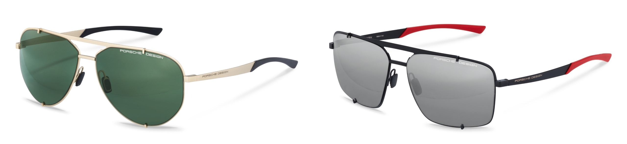 The P‘8920 classic aviator combines a gold hue frame with green tinted lenses while P‘8919 offers a squared aviator shape.