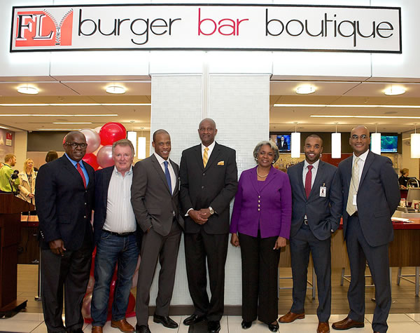 At the opening of the Fly Burger Bar and Boutique, were (l-r): Jerome Russell, President of H.J. Russell & Company; Certified Master Chef Tom Catherall, creator of Fly Burger; Kevin Holt, Founder of H & H Hospitality; Miguel Southwell, interim General Manager Atlanta Airport, Donata Russell Major, CEO Concessions International; Randy Hazelton, Founder of H & H Hospitality; Anthony Joseph, President of Concessions International |