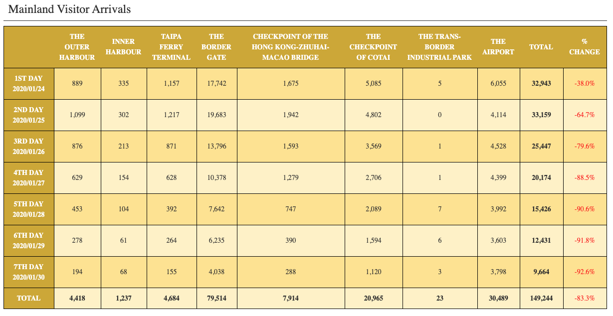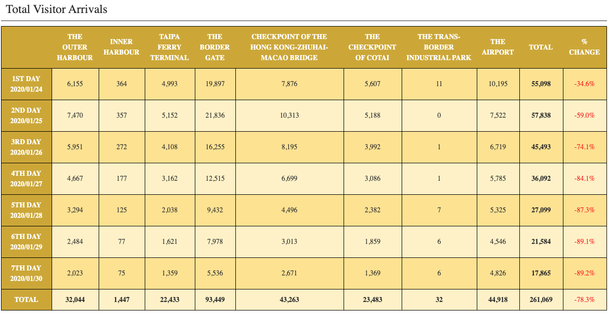 Visitor numbers have collapsed, plummeting -69% in the first four days of the Lunar New Year festive period. Arrivals from the Mainland were down by over -75%. Travel retailers, such as DFS, and the closely related gaming, hotel and restaurant sectors, are all reeling from the downturn [Source: Macau Daily Times]