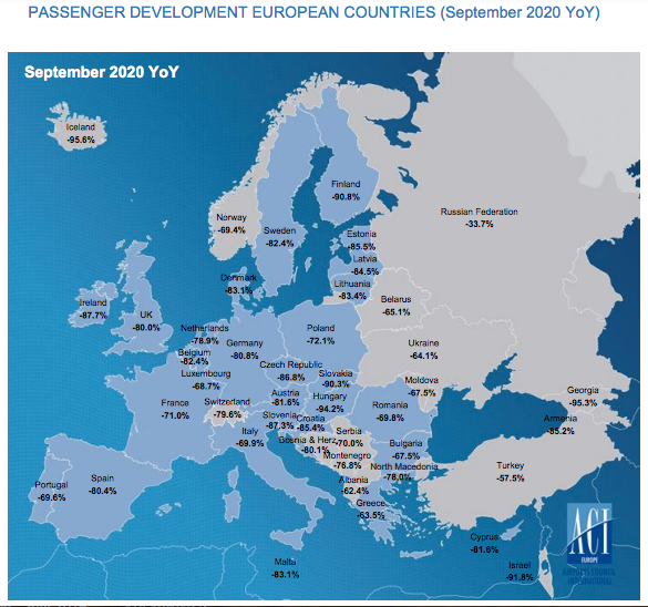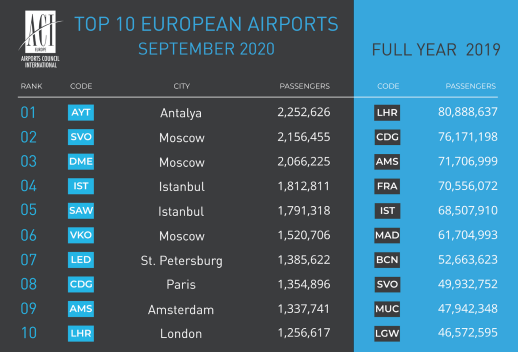 ACI Europe noted: “This situation has turned the top ten European airport league upside down. In September, the busiest European airport was Antalya with just 2.25 million passengers (-53.5%), followed by Moscow Sheremetyevo (-53.5%), Moscow Domodedovo (-26.2%) and Istanbul (-71%).