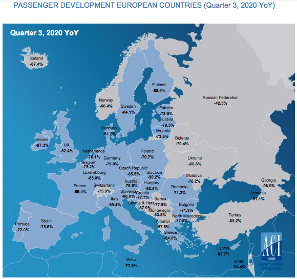 EUROPE. Airports Council International (ACI) Europe today reported its latest figures, with passenger traffic down by -81% year-on-year so far in 2020, or 1.5 billion travellers (to 15 November).