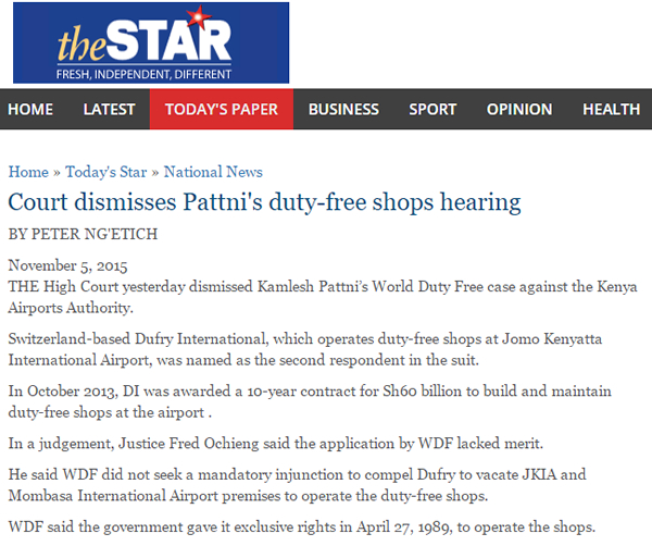 Separately, World Duty Free of Kenya (owned by local businessman Kamlesh Pattni) took its own case, alleging that it had exclusive rights to operate the shops under an agreement dating back to 1989.