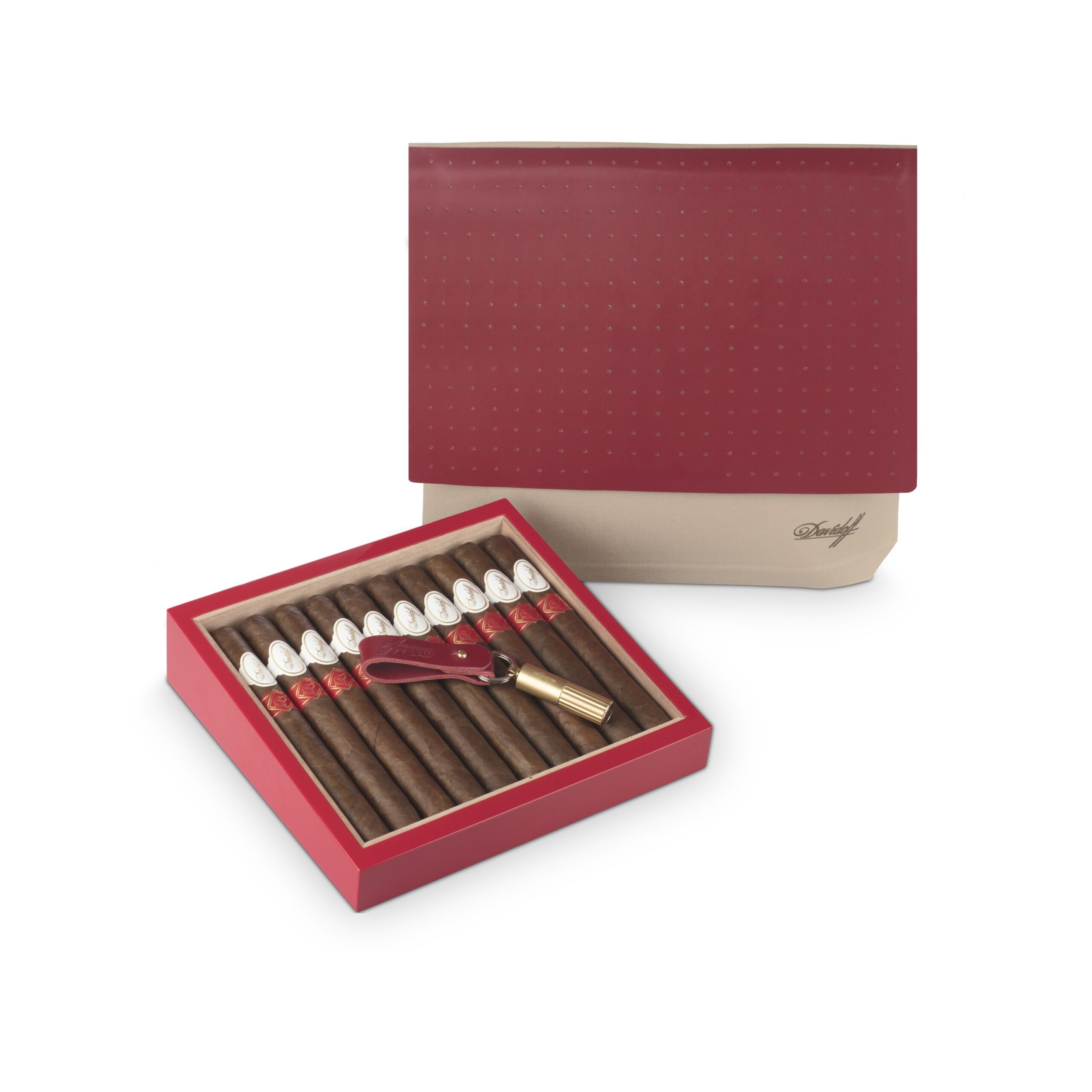 The Year of the Dog accessories include a Travel Humidor, with a removable tray to hold eight cigars, and a stainless steel Duocut Double Blade Punch Cutter on a leather key holder.
