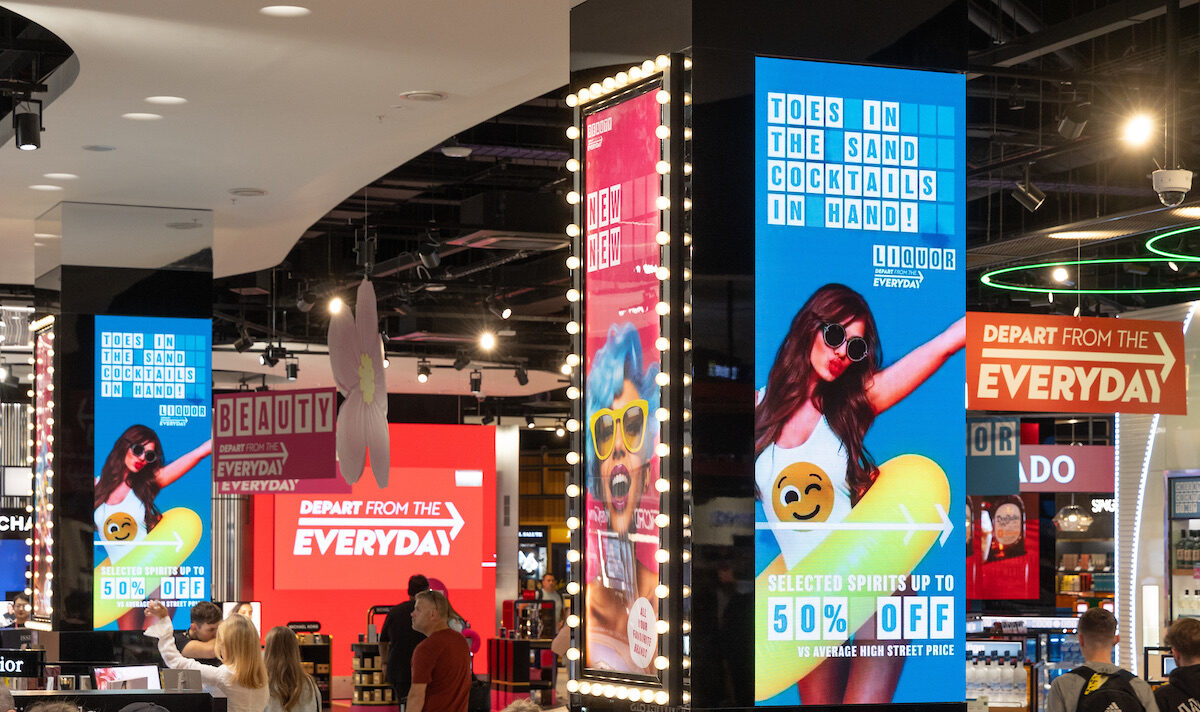 (Above and below) The OOH media campaign features throughout the store and by the entrances and exits of World Duty Free