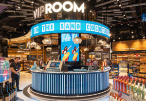 (Above and below) An in-store bar, designed to replicate the airport baggage claim area and complete with luggage-shaped liquor displays, offers complimentary beach-themed cocktails and gamification