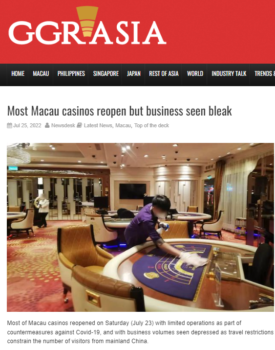 According to GGR Asia, a specialist media title for Asia’s gaming industry, most Macau casinos reopened on Saturday 23 July with limited operations in line with COVID-19 measures. Business volumes are depressed due to travel restrictions constraining the number of Mainland visitors, the report noted.