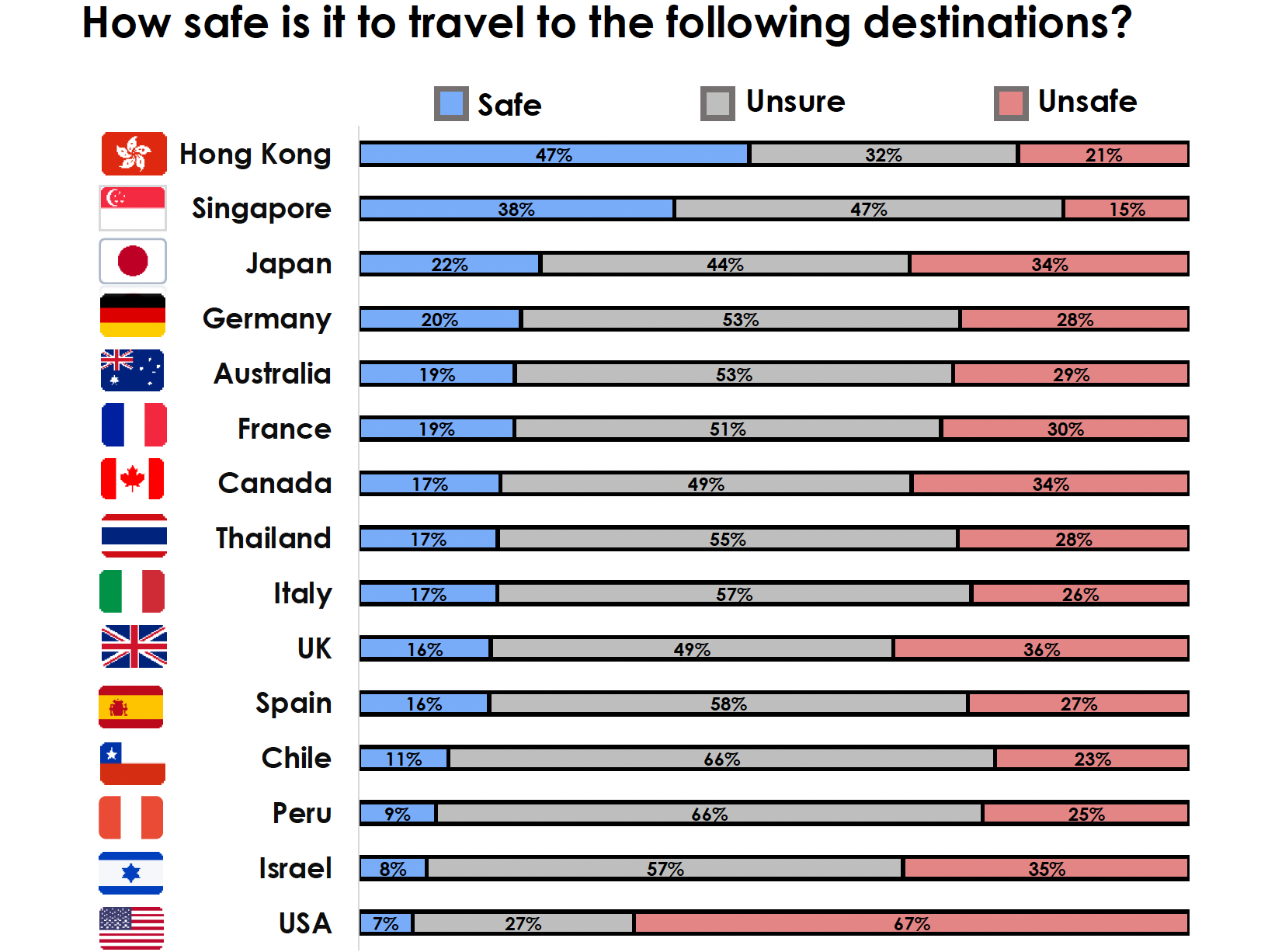 When assessing 15 outbound destinations around the world (see table below), the survey shows that Chinese travellers are now less likely to categorise these destinations as ‘unsafe’.