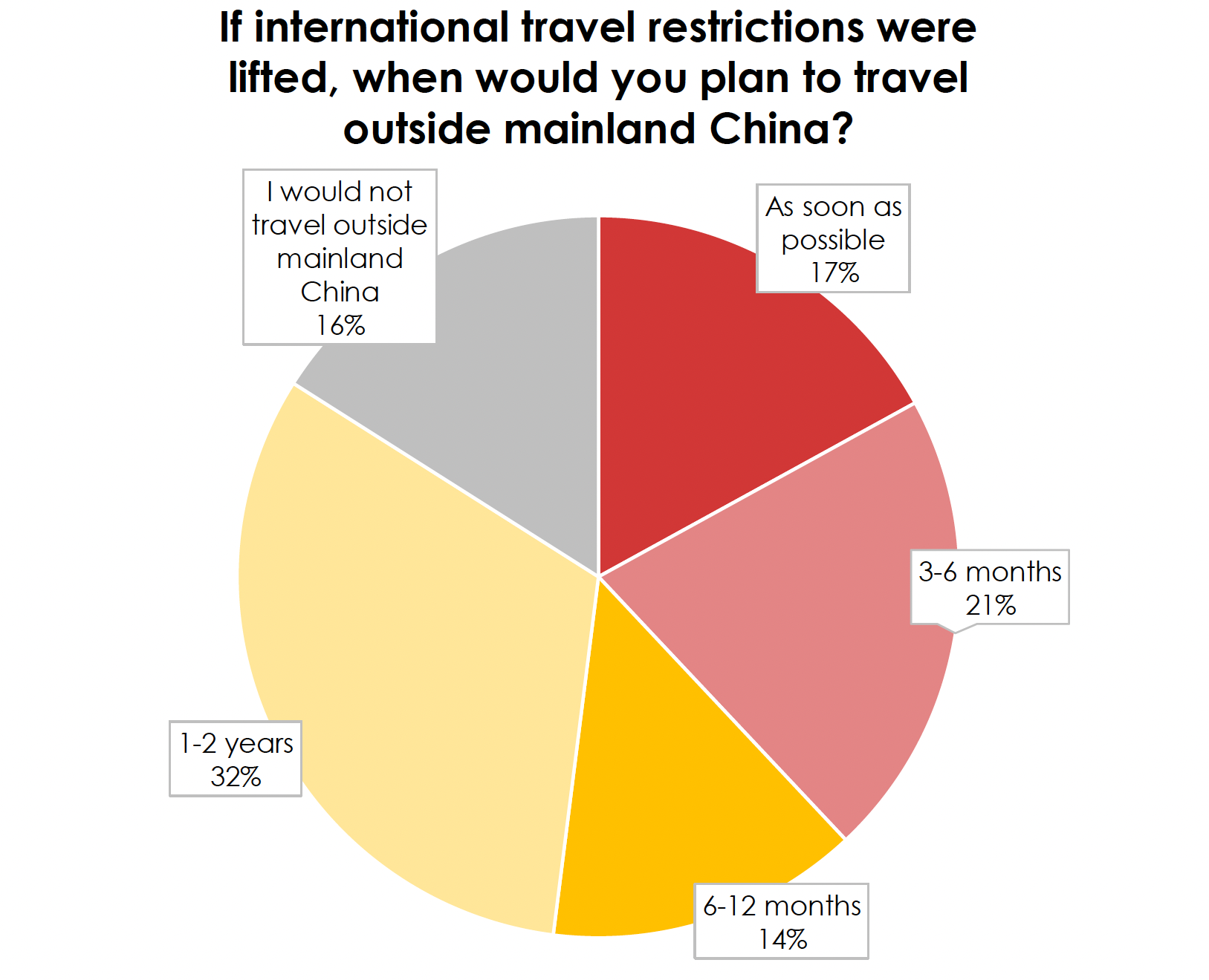 Some 17% of survey respondents say they will travel outside the Chinese Mainland as soon as possible when restrictions are released, with the number rising to 52% for the first 12 months after this occurs. “Pent-up demand is real, and growing, and the travel industry should get ready,” the report said.