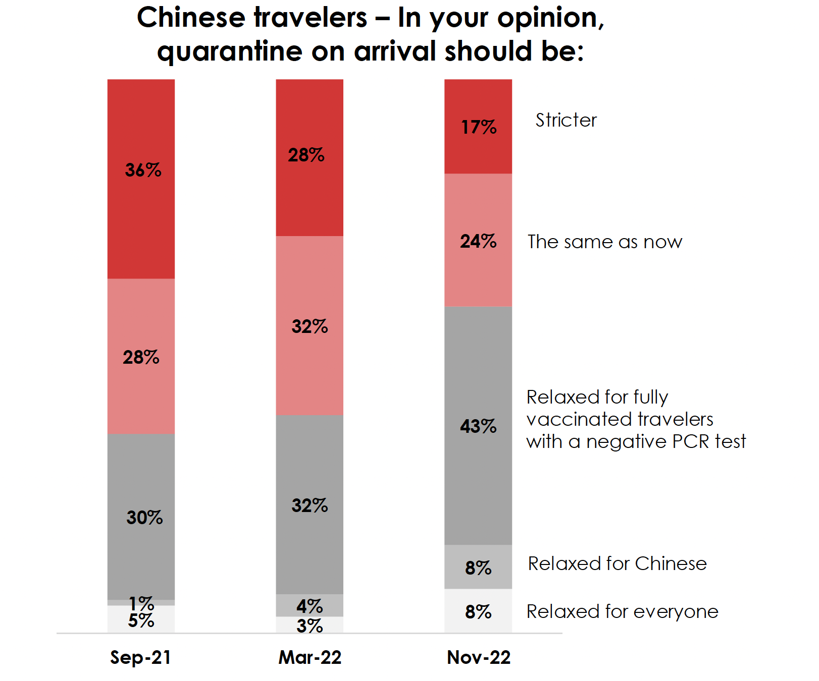 The report reveals that popular opinion about quarantine-on-arrival has changed dramatically since last year, with nearly 60% now saying it should be relaxed (see table below). This is an increase of 20 percentage points from Dragon Trail’s Spring 2022 Chinese traveller sentiment survey.