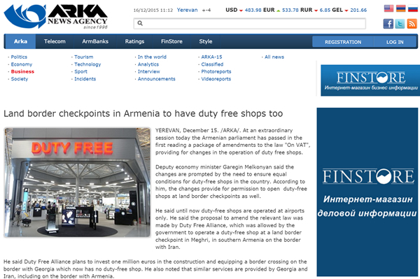 In the release, Deputy Economy Minister Garegin Melkonyan said the proposal to amend the law was made by Duty Free Alliance. The Georgia-based travel retailer is being permitted by the government to operate a duty free shop at a land border checkpoint in Meghri, southern Armenia, on the border with Iran.