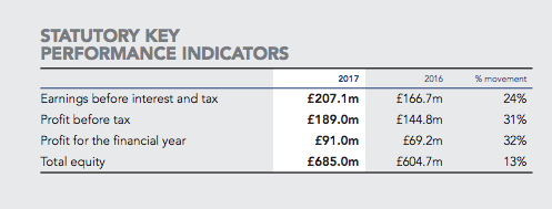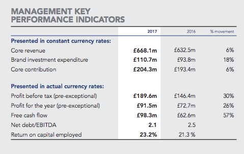Pre-tax profit (pre-exceptional) was £189.6 million (US$246 million), up +30%, and core revenues of £668.1 million (US$868 million) increased +6% versus last year.