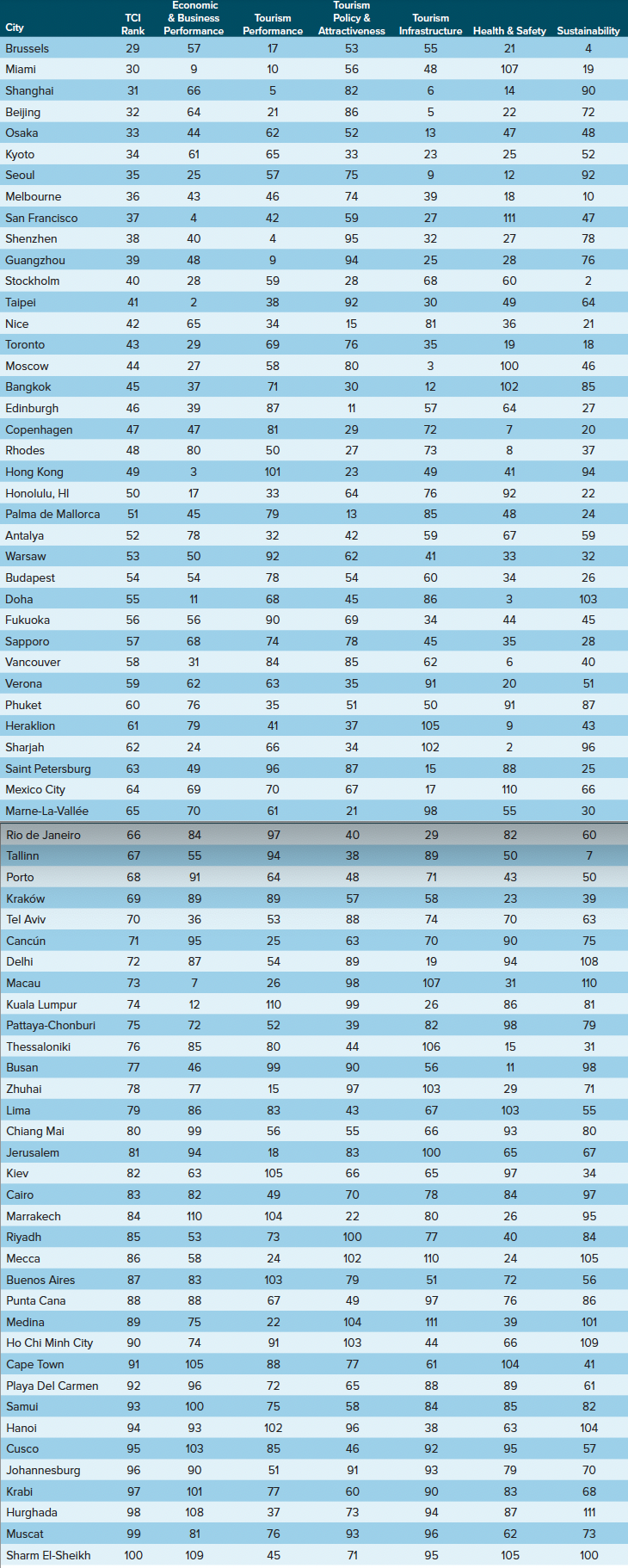 Spanish cities also feature prominently among the top ten. Barcelona increased in ranking by six places to tenth and Madrid ranks fourth. Madrid is placed highest in terms of Sustainability of all cities in the top 100 and third overall in terms of Tourism Policy and Attractiveness.