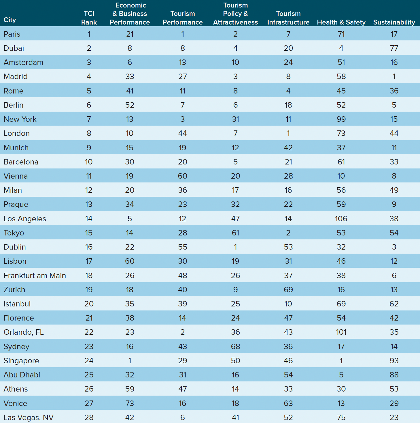Paris heads the list in the overall index. According to the report’s metrics, the city has the highest ranking in terms of Tourism Performance and second highest ranking in terms of Tourism Policy and Infrastructure globally.