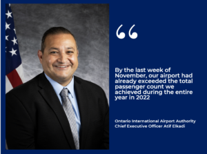 “Ontario International continues to show strong and steady passenger growth, and by the last week of November, our airport had already exceeded the total passenger count we achieved during the entire year in 2022,” said Ontario International Airport Authority Chief Executive Officer Atif Elkadi.