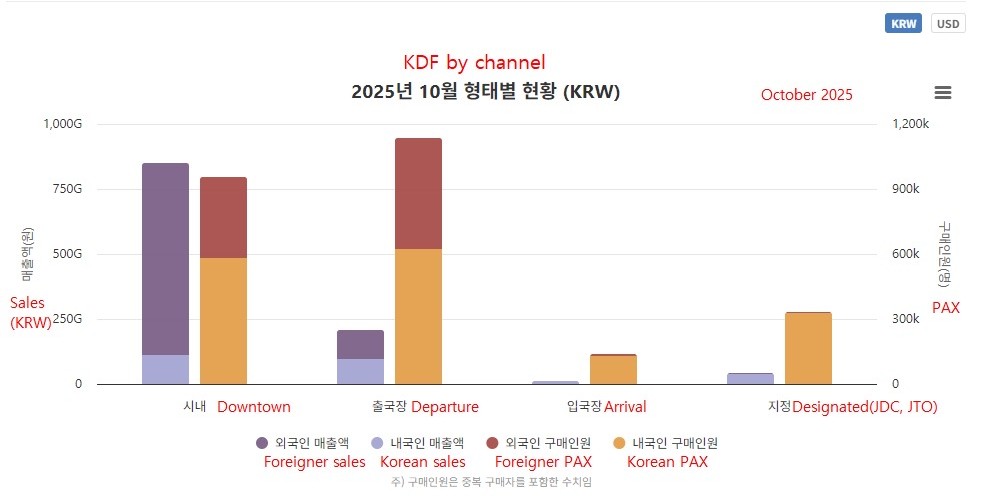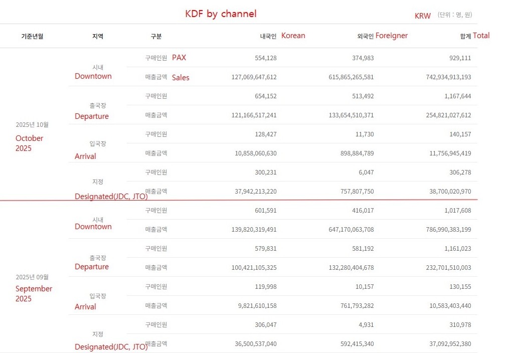 The airport departures channel presented a more positive picture with sales rising +22.2% year-on-year and +9.5% month-on-month to KRW254,821,027,612 (US$173.6 million) on a customer base up +2.8% over October 2025 and +0.6% month-on-month.